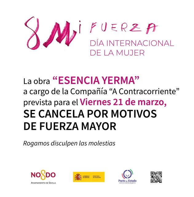 La obra"ESENCIA YERMA" a cargo de la compañía "A Contracorriente" prevista para el viernes 21 de marzo, SE CANCELA POR MOTIVOS DE FUERZA MAYOR