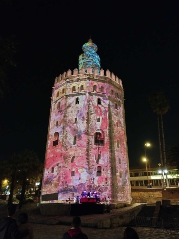 El concepto de este proyecto parte de la representación de imágenes panorámicas ambientadas en la Sevilla de la Edad Media (“Qui non ha visto Sevilla, non ha visto maravilla”) sobre la fachada sur de este edificio. Se trata de abstracciones visuales de la propia torre y de la profusa iconografía medieval y renacentista desde un punto de vista contemporáneo, con códices, miniaturas o imposibles juegos geométricos. Se conectan música e imagen a través de símbolos almohades, el mudéjar de Pedro I que fue responsable de su ampliación y, por supuesto, la relación inseparable con el río, motivos propios de una época de amplia relevancia de la ciudad en el contexto político, social y cultural del país marcado por la confluencia de las tres culturas.