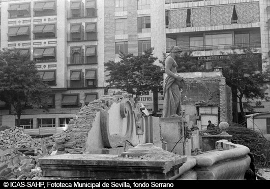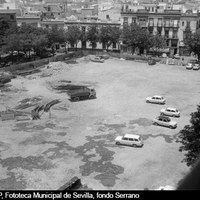 Galería fotográfica "Plaza de la Encarnación: de espacio conventual a reclamo turístico" Plano Geométrico de la Ciudad de Sevilla, dedicado al asistente López de Lerena. Año 1788. En este detalle apreciamos el antiguo convento de ... Plano (planta) de la Plaza de Abastos de la Encarnación, obra del arquitecto Melchor Cano (1794-1842). 1831 740 x 495 mm. El recinto está dividido en ... Anuncio con las normas de régimen interior y horarios del mercado de abastos de la Encarnación. 1890, julio, 1º. ©ICAS-SAHP, Archivo Municipal de ... Vista parcial del centro histórico de la ciudad. Plaza de la Encarnación y mercado central. 1926 © ICAS-SAHP, Fototeca Municipal de Sevilla, fondo ... Mercado de la Encarnación. Fuente central y puestos para la venta. La fuente, la más antigua de la ciudad, fue inaugurada en 1720 con motivo se las ... Los nazarenos de la Hermandad de los Negritos rodeando el mercado central. Al frente, la fachada lateral de la iglesia de la Anunciación y a la ... Con la puesta en marcha del proyecto de ensanche del eje Campana-Osario en 1948, se procedió al derribo el tercio meridional del mercado para abrir ... El proyecto de ensanche del eje Campana-Osario en 1948, trajo consigo el derribo de parte del mercado para abrir una plaza pública, lo que provocó el ... En la nueva plaza pública tenía su última parada el tranvía número 25 Nervión-Cruz del Campo-Plaza de la Encarnación. Se aprecia la embocadura de las ... La estrechez de la antigua calle Imagen originaba que el tranvía de la línea 25 dejara un mínimo espacio entre ambas aceras para el paso de los ... La nieve acumulada en los accesos al mercado no fue impedimento para el desarrollo de la actividad de los placeros y del público que acudió a hacer ... Inicio del derribo de la manzana de casas entre las calles Imagen y Bolsa para la ejecución del proyecto de ensanche. Las autoridades locales y el ... Calle Imagen tras el derribo de la manzana entre calles Imagen y Bolsa para el ensanche del eje este-oeste. Al fondo, la torre de San Pedro. ... Vista cenital de la plaza de la Encarnación y el nuevo trazado de la calle Imagen tras el ensanche, con el edificio racionalista de la acera derecha, ... Plaza de la Encarnación esquina a la calle José Gestoso. 1953-1955 ©ICAS-SAHP, Fototeca Municipal de Sevilla, fondo Arquitectura Civil Sevillana Inauguración y bendición de los autobuses urbanos de la línea 15 Plaza de la Encarnación-Gran Plaza. 14 de agosto de 1959. ©ICAS-SAHP, Fototeca ... Ambiente de un día de mercado en la fachada norte junto a la embocadura de la calle Regina. 1962 ©ICAS-SAHP, Fototeca Municipal de Sevilla, fondo ... Decoración navideña en el edificio de Almacenes Vázquez (tejidos y confección) en la esquina de la calle Puente y Pellón. 1965 ©ICAS-SAHP, Fototeca ... Vista cenital del Mercado de la Encarnación. 1967 ©ICAS-SAHP, Fototeca Municipal de Sevilla, fondo Cubiles Mercado de la Encarnación. Estado de los puestos en 1971. ©ICAS-SAHP, Fototeca Municipal de Sevilla, fondo Serrano Restos de la fachada del mercado apuntalada y cubierta de vallas que se utilizaban como soporte publicitario para las carteleras de cine o anuncios ... Demolición del mercado de abastos. Estado que presentaba el espacio de la plaza de abastos tras el derribo que se había iniciado en 1973. Julio de ... Fachada principal del mercado derribada. En pie ha quedado exenta la escultura de la diosa Ceres, obra de Juan Luis Vasallo. Tras su restauración la ... La fuente de la Encarnación, objeto del juego de los niños ante la pasividad de los adultos. Al fondo, el local de almacenes de confección Vázquez a ... Aspecto que presentaba la plaza de la Encarnación en 1977 aún abierta al tráfico rodado. A la derecha las características paradas de autobús urbano ... Una vez trasladado el mercado a un solar próximo y ante la tardanza para acometer un proyecto definitivo, la parcela de la plaza de abastos se ... Parada de microbuses de la línea B Los Remedios-Plaza de la Encarnación. Esta línea se había inaugurado en 1966. 1978-1979 ©ICAS-SAHP, Fototeca ... Venta ambulante de periódicos en la plaza de la Encarnación debido a una huelga convocada por la Confederación Española de Vendedores de Prensa para ... Tras largos años de abandono, en 2004 el Ayuntamiento de Sevilla convoca un concurso internacional de ideas para reordenar la Encarnación y que ... Desde su inauguración en mayo de 2011, la plaza ha vuelto a tener el protagonismo de otra época y es hoy un escenario imprescindible para cualquier ... Acciones de documento Imprimir Enviar Compartir Compartir en facebook Compartir en twitter Compartir en linkedin Compartir en whatsapp