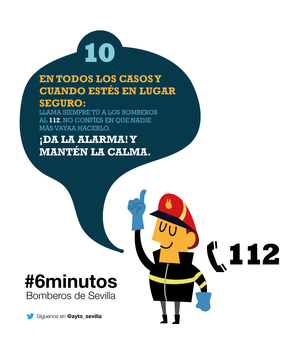 10.- En todos los casos y cuando estés en lugar seguro: Llama siempre tú a los bomberos al 112 ó 080, no confíes en que nadie más vaya a hacerlo. ¡Da la alarma! y mantén la calma.