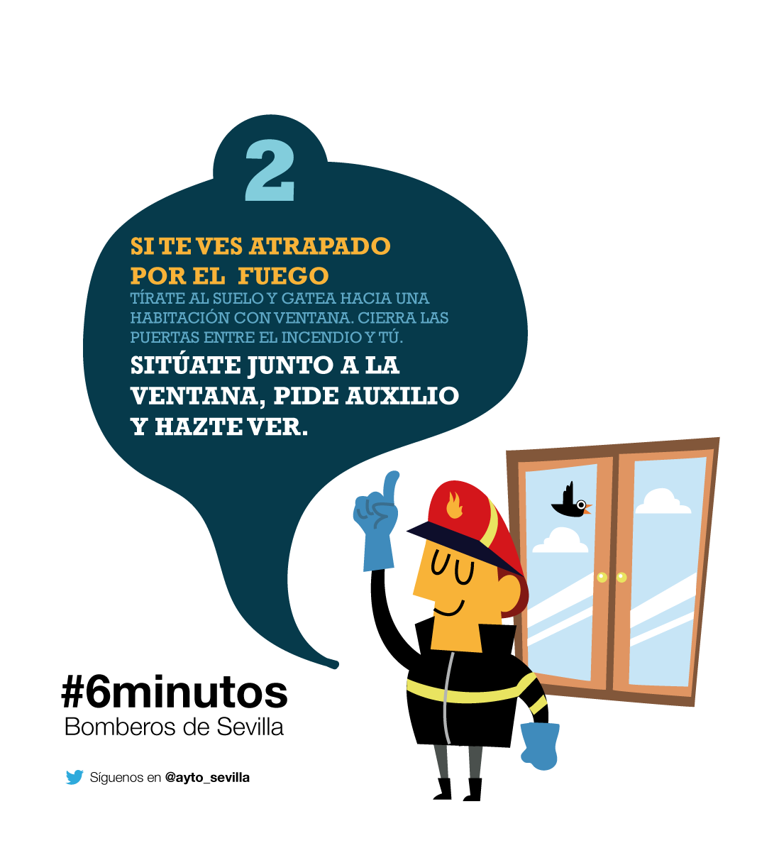 2.- Si te ves atrapado por el fuego , tírate al suelo y gatea hacia una habitación con ventana, cierra las puertas entre el incendio y tú. Sitúate junto a la ventana, pide auxilio y hazte ver.