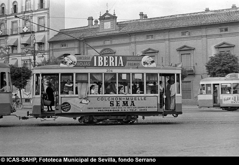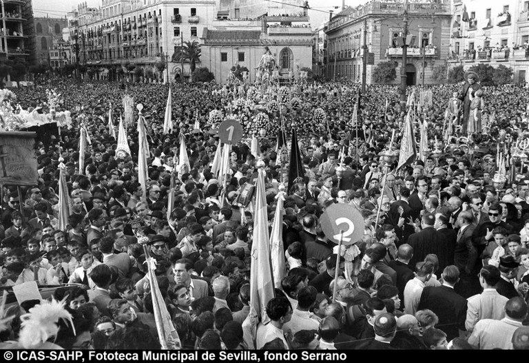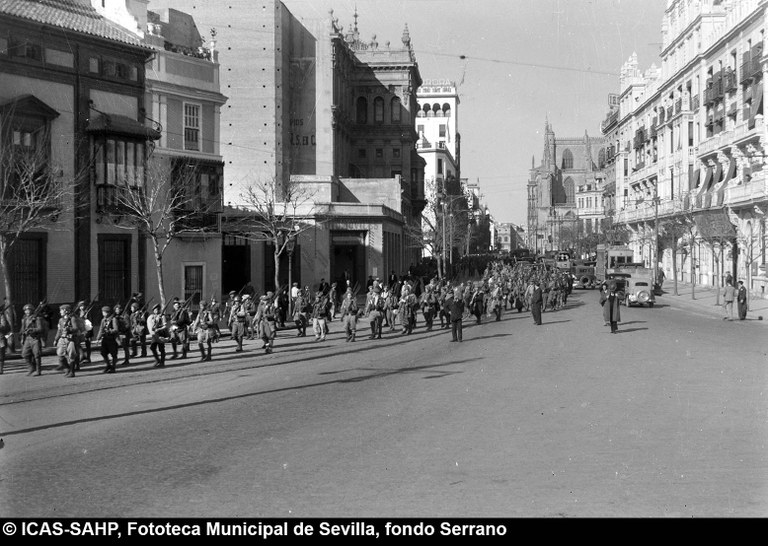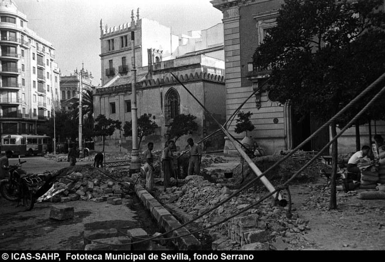 Galería fotográfica Detalle del plano de 1848 en el que se aprecia el entorno de la Puerta de Jerez junto al arroyo Tagarete. Ésta fue derribada con los paños de muralla ... Entorno de la Puerta de Jerez por el que circula un tranvía de mulas. Al fondo, el antiguo palacio de los Vicentelo de Leca, propiedad de los condes ... El teatro de verano Eslava en los jardines del mismo nombre fue construido en 1887 por Antonio Capó sobre el anterior del mismo nombre y clausurado ... Embocadura de la calle San Fernando hacia la Puerta de Jerez. En el centro el antiguo palacio de los Vicentelo de Leca, entonces Intendencia Militar ... Tranvía eléctrico con jardinera circulando por la Puerta de Jerez esquina a la calle Almirante Lobo. Bajo el pavimento discurría ya el arroyo ... Vista aérea de la Puerta de Jerez y el hotel Alfonso XIII tras las obras de ensanche y derribo de las manzanas de edificios de la calle Maese Rodrigo ... La fuente de Híspalis, encargada por el Ayuntamiento en 1928 al escultor Manuel Delgado Brackenbury y diseñada por Juan Bautista Míguez Roca. Fue ... La fuente de Híspalis, encargada por el Ayuntamiento en 1928 al escultor Manuel Delgado Brackenbury y diseñada por Juan Bautista Míguez Roca. Fue ... Manifestación de obreros en paro durante el reparto de bonos en el Paseo de Cristina. 26 de septiembre de 1931 ©ICAS-SAHP, Fototeca Municipal de ... Fachada de la Casa-Palacio de los Guardiola. La casa que perteneció a Andrés Parladé y Sánchez de Quirós, conde de Aguiar, fue construida por los ... Manifestación espontánea contra Manuel Azaña en la Puerta de Jerez. 8 de abril de 1934. ©ICAS-SAHP, Fototeca Municipal de Sevilla, fondo Serrano Francisco Franco a su llegada al cuartel general en el Palacio de Yanduri el 7 de agosto de 1936. Se trata del primer cuartel general de Franco en ... Salida de tropas hacia el frente a su paso por la Puerta de Jerez. 1936-1937. ©ICAS-SAHP, Fototeca Municipal de Sevilla, fondo Serrano Celebración del final de la Guerra Civil el 17 de abril de 1939. Francisco Franco saluda desde el balcón del Palacio de Yanduri a un grupo de la ... Apertura de los actos de la Semana de la Santa Misión. Procesión misional de la comitiva que había partido del Seminario en el Palacio de San Telmo. ... Inundación de la Puerta de Jerez y Avenida de la Constitución por la rotura del muro de contención de las obras de defensa del río Guadaíra. Enero de ... La nevada del 2 de febrero de 1954 cubrió de blanco la fuente de Híspalis. ©ICAS-SAHP, Fototeca Municipal de Sevilla, fondo Serrano Puerta de Jerez. Obras de mejora en los aledaños de los jardines de Cristina. 1955-1959 ©ICAS-SAHP, Fototeca Municipal de Sevilla, fondo Gelán Coronación canónica de María Auxiliadora de los Salesianos de la Santísima Trinidad. Acto oficiado por el cardenal Pedro Segura en la Puerta de ... Tranvía con remolque a su paso por Puerta de Jerez. 1957-1959. Los últimos tranvías circularon en Sevilla en 1960. ©ICAS-SAHP, Fototeca Municipal de ... La escultura de San Cristobal, obra de Martínez Montañés de la Iglesia del Salvador es portada en un jeep militar hacia el Parque de Mª Luisa con ... Caseta del Centro Meteorológico Nacional en las inmediaciones de la Puerta de Jerez. 1959 ©ICAS-SAHP, Fototeca Municipal de Sevilla, fondo Serafín Vista cenital de las inmediaciones de la Puerta de Jerez. A la derecha el Hotel Cristina, construido para la Exposición Iberoamericana de 1929. ... Colocación de nuevo alumbrado público en la Puerta de Jerez. 1961-1963 ©ICAS-SAHP, Fototeca Municipal de Sevilla, fondo Serrano La grúa de un camión del Servicio de Bomberos instalando un árbol de Navidad en la Puerta de Jerez. 1965-1970 ©ICAS-SAHP, Fototeca Municipal de ... Clausura de la Santa Misión. Acto celebrado en la Puerta de Jerez y oficiado por el cardenal José María Bueno Monreal y presidido por el paso de la ... Paso del Cristo de la Buena Muerte en su primera salida de los Estudiantes desde la Fábrica de Tabacos. Marzo de 1967 ©ICAS-SAHP, Fototeca Municipal ... Sondeos de prospección para la construcción del metropolitano en Sevilla. Julio de 1968. ©ICAS-SAHP, Fototeca Municipal de Sevilla, fondo Serafín Intenso tráfico rodado en la Puerta de Jerez dirigido por un guardia urbano. Junio de 1968 ©ICAS-SAHP, Fototeca Municipal de Sevilla, fondo Serafín Anuncio de los Festivales de España que se celebraban en el mes de septiembre en el Parque de Mª Luisa. Agosto de 1972 ©ICAS-SAHP, Fototeca Municipal ... Nuevos semáforos en la Puerta de Jerez. Regulación del tráfico e instalación de una isleta que dividía las direcciones de la calzada. 1975 ... Tras la peatonalización del eje San Fernando-Puerta de Jerez-Avenida de la Constitución-Plaza Nueva inaugurada en 2007, la fisonomía y el uso público ... Preparativos para la Navidad en Puerta de Jerez. La fuente de Híspalis en obras de rehabilitación y recuperación de las figuras de los niños “meones” ... Acciones de documento Imprimir Enviar Compartir Compartir en facebook Compartir en twitter Compartir en linkedin Compartir en whatsapp