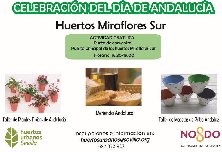- Las iniciativas relacionadas con el Medio Ambiente continúan en los Huertos Urbanos con una serie de actuaciones singulares que incluyen talleres de maceteros y patios andaluces, plantaciones de arbustos y meriendas tradicionales en Miraflores Sur. Esta actividad tiene lugar el día 28 desde las 16.30 hasta las 19.00 horas y tiene como punto de encuentro la puerta principal.