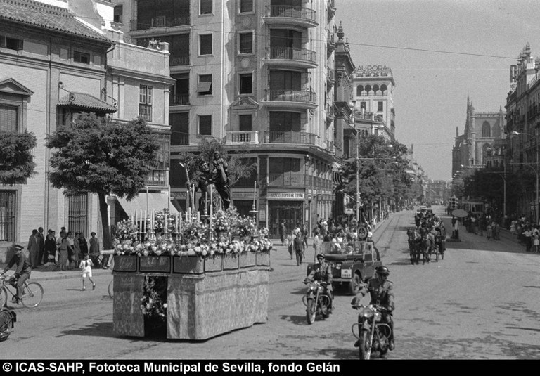 Galería fotográfica Detalle del plano de 1848 en el que se aprecia el entorno de la Puerta de Jerez junto al arroyo Tagarete. Ésta fue derribada con los paños de muralla ... Entorno de la Puerta de Jerez por el que circula un tranvía de mulas. Al fondo, el antiguo palacio de los Vicentelo de Leca, propiedad de los condes ... El teatro de verano Eslava en los jardines del mismo nombre fue construido en 1887 por Antonio Capó sobre el anterior del mismo nombre y clausurado ... Embocadura de la calle San Fernando hacia la Puerta de Jerez. En el centro el antiguo palacio de los Vicentelo de Leca, entonces Intendencia Militar ... Tranvía eléctrico con jardinera circulando por la Puerta de Jerez esquina a la calle Almirante Lobo. Bajo el pavimento discurría ya el arroyo ... Vista aérea de la Puerta de Jerez y el hotel Alfonso XIII tras las obras de ensanche y derribo de las manzanas de edificios de la calle Maese Rodrigo ... La fuente de Híspalis, encargada por el Ayuntamiento en 1928 al escultor Manuel Delgado Brackenbury y diseñada por Juan Bautista Míguez Roca. Fue ... La fuente de Híspalis, encargada por el Ayuntamiento en 1928 al escultor Manuel Delgado Brackenbury y diseñada por Juan Bautista Míguez Roca. Fue ... Manifestación de obreros en paro durante el reparto de bonos en el Paseo de Cristina. 26 de septiembre de 1931 ©ICAS-SAHP, Fototeca Municipal de ... Fachada de la Casa-Palacio de los Guardiola. La casa que perteneció a Andrés Parladé y Sánchez de Quirós, conde de Aguiar, fue construida por los ... Manifestación espontánea contra Manuel Azaña en la Puerta de Jerez. 8 de abril de 1934. ©ICAS-SAHP, Fototeca Municipal de Sevilla, fondo Serrano Francisco Franco a su llegada al cuartel general en el Palacio de Yanduri el 7 de agosto de 1936. Se trata del primer cuartel general de Franco en ... Salida de tropas hacia el frente a su paso por la Puerta de Jerez. 1936-1937. ©ICAS-SAHP, Fototeca Municipal de Sevilla, fondo Serrano Celebración del final de la Guerra Civil el 17 de abril de 1939. Francisco Franco saluda desde el balcón del Palacio de Yanduri a un grupo de la ... Apertura de los actos de la Semana de la Santa Misión. Procesión misional de la comitiva que había partido del Seminario en el Palacio de San Telmo. ... Inundación de la Puerta de Jerez y Avenida de la Constitución por la rotura del muro de contención de las obras de defensa del río Guadaíra. Enero de ... La nevada del 2 de febrero de 1954 cubrió de blanco la fuente de Híspalis. ©ICAS-SAHP, Fototeca Municipal de Sevilla, fondo Serrano Puerta de Jerez. Obras de mejora en los aledaños de los jardines de Cristina. 1955-1959 ©ICAS-SAHP, Fototeca Municipal de Sevilla, fondo Gelán Coronación canónica de María Auxiliadora de los Salesianos de la Santísima Trinidad. Acto oficiado por el cardenal Pedro Segura en la Puerta de ... Tranvía con remolque a su paso por Puerta de Jerez. 1957-1959. Los últimos tranvías circularon en Sevilla en 1960. ©ICAS-SAHP, Fototeca Municipal de ... La escultura de San Cristobal, obra de Martínez Montañés de la Iglesia del Salvador es portada en un jeep militar hacia el Parque de Mª Luisa con ... Caseta del Centro Meteorológico Nacional en las inmediaciones de la Puerta de Jerez. 1959 ©ICAS-SAHP, Fototeca Municipal de Sevilla, fondo Serafín Vista cenital de las inmediaciones de la Puerta de Jerez. A la derecha el Hotel Cristina, construido para la Exposición Iberoamericana de 1929. ... Colocación de nuevo alumbrado público en la Puerta de Jerez. 1961-1963 ©ICAS-SAHP, Fototeca Municipal de Sevilla, fondo Serrano La grúa de un camión del Servicio de Bomberos instalando un árbol de Navidad en la Puerta de Jerez. 1965-1970 ©ICAS-SAHP, Fototeca Municipal de ... Clausura de la Santa Misión. Acto celebrado en la Puerta de Jerez y oficiado por el cardenal José María Bueno Monreal y presidido por el paso de la ... Paso del Cristo de la Buena Muerte en su primera salida de los Estudiantes desde la Fábrica de Tabacos. Marzo de 1967 ©ICAS-SAHP, Fototeca Municipal ... Sondeos de prospección para la construcción del metropolitano en Sevilla. Julio de 1968. ©ICAS-SAHP, Fototeca Municipal de Sevilla, fondo Serafín Intenso tráfico rodado en la Puerta de Jerez dirigido por un guardia urbano. Junio de 1968 ©ICAS-SAHP, Fototeca Municipal de Sevilla, fondo Serafín Anuncio de los Festivales de España que se celebraban en el mes de septiembre en el Parque de Mª Luisa. Agosto de 1972 ©ICAS-SAHP, Fototeca Municipal ... Nuevos semáforos en la Puerta de Jerez. Regulación del tráfico e instalación de una isleta que dividía las direcciones de la calzada. 1975 ... Tras la peatonalización del eje San Fernando-Puerta de Jerez-Avenida de la Constitución-Plaza Nueva inaugurada en 2007, la fisonomía y el uso público ... Preparativos para la Navidad en Puerta de Jerez. La fuente de Híspalis en obras de rehabilitación y recuperación de las figuras de los niños “meones” ... Acciones de documento Imprimir Enviar Compartir Compartir en facebook Compartir en twitter Compartir en linkedin Compartir en whatsapp