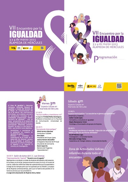 - VII ENCUENTRO POR LA IGUALDAD 2023. La Delegación de Igualdad y Recursos Humanos, a través de su Dirección General de Igualdad, celebrará el VII Encuentro por la Igualdad, los próximos viernes 3 y sábado 4 de marzo de 2023, en el espacio urbano situado en la céntrica Alameda de Hércules, durante ambas jornadas.